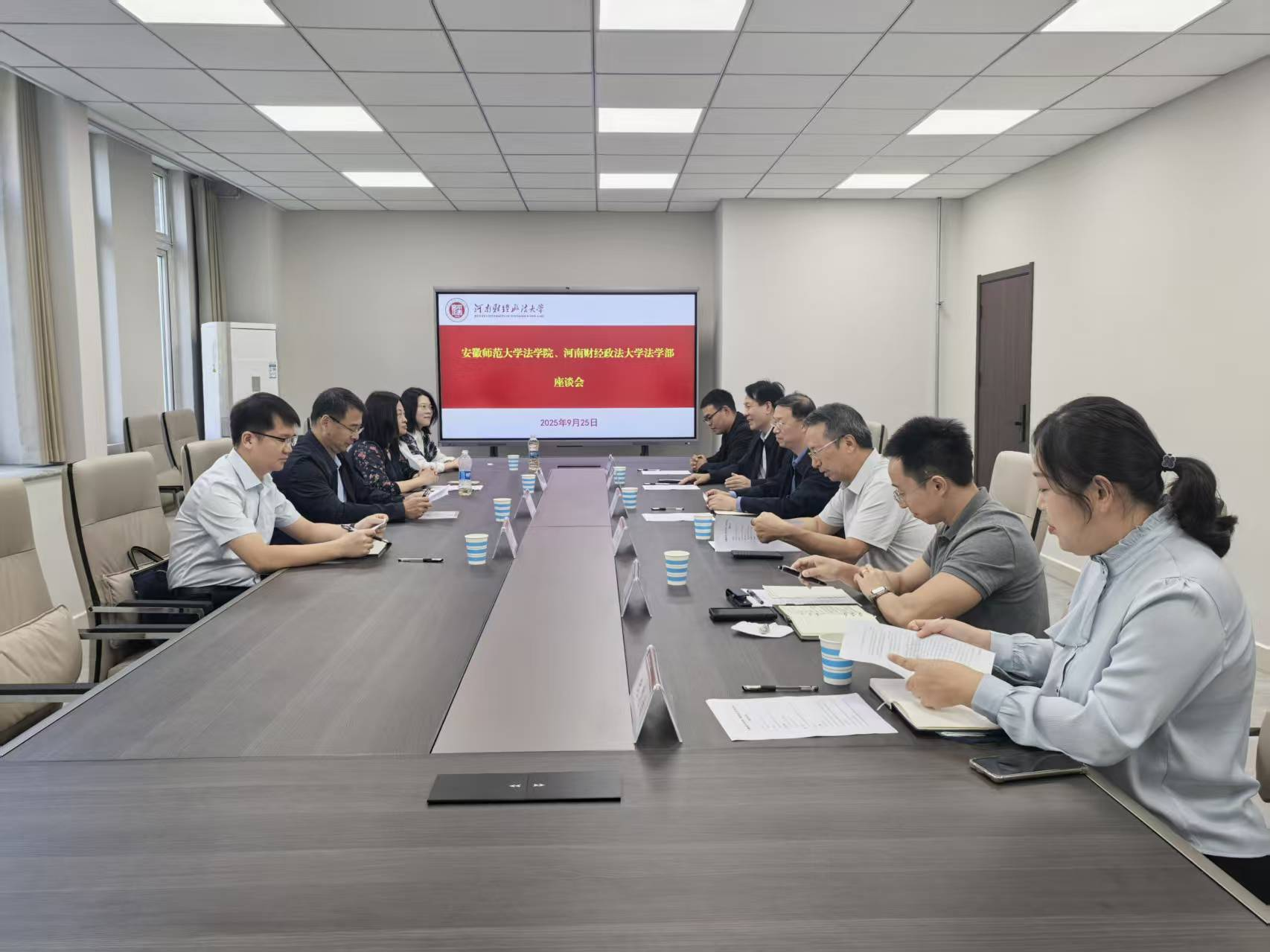 会上,张安毅首先对郭泽强院长一行表示欢迎,并介绍了河南财经政法大学学校历史发展情况、学部制改革成果、以学习者为中心理念及其制度配套现状。郭泽强院长首先说明了此行的调研目的,并介绍了安徽师范大学的深厚历史脉络及当下锐意改革的意图,并就法学学科与师资队伍建设情况进行了全面系统的介绍,尤其强调了同河南财经政法大学法学科展开交叉融合探索的思路。曹守晔教授就两校合作的整体思路、合作框架、发展规划做了独到、精彩的剖析,并提出进一步发展的建议。郑佳宁教授就中国政法大学在学科交叉融合发展,尤其在电子商务法方面的有益成熟经验做了分享和介绍,并分享了中国政法大学在打破教学与科研壁垒,提升教师教学参与兴趣的教育教学业绩等级表等相关有益做法。我院巩寒冰副院长就刑事司法学院现阶段刑法学学科建设及现阶段课程团队、学习导师和课程设置调整情况进行了介绍和汇报。与会领导老师进行了积极、热烈的讨论和交流。