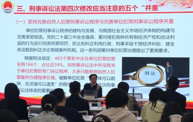本次研讨会中,最高人民检察院原法律政策研究室主任高景峰就“刑事诉讼法第四次修改若干前沿问题”作专题报告,其论述以“加强对执法司法权的监督制约”为核心视角,为修法工作提供了清晰的理论框架与实践指引。高景峰主任首先明确指出,本次修法必须确立并坚守五项核心原则:坚持党的全面领导、坚守以人民为中心的根本立场、加强人权执法司法保障、加强对执法司法权的监督制约、坚持统筹国内法治与涉外法治,并始终坚持问题导向。进而,他系统阐述了修法的重点、路径与“五个并重”的辩证关系。高主任提出,修法工作应重点围绕贯彻中央精神、落实改革部署及回应社会关切展开。他特别论证了坚持控制犯罪与保障人权并重、程序公正与实体真实并重等“五个并重”,是构建科学权力制约格局、实现有效监督的方法论基础。在具体制度层面,高景峰主任精准聚焦于若干关键领域。他深入分析了单位犯罪与自然人犯罪程序均衡化、强制措施的司法审查完善以及“挂案”治理机制等议题,指出这些正是将权力监督理念落地为具体法律条款的核心抓手。综上所述,高景峰主任的报告高屋建瓴,从监督制约权力的视角,系统论证了修法的原则、路径与重点方案。他的论述为此次刑事诉讼法修改提供了权威的学理支撑与明确的行动指南,对于推动构建权责清晰、制约有效的刑事诉讼程序具有至关重要的指导意义。